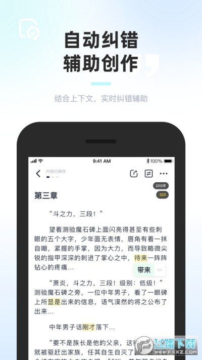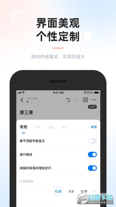 2,支持语音输入、特色草稿箱、章节排序、首行自动缩进、自动排版、小说预览、快捷标点、夜间模式、字体大小调节、导出TXT文件、横屏竖屏写作等众多功能