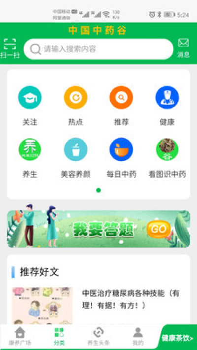 中国中药谷是一款为人类健康服务的APP工具。应用包括康养超市、养生头条、名医问诊等几大部分内容。