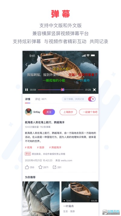 2. 弹幕:支持中文和外文版、兼容横屏竖屏弹幕平台,支持炫彩弹幕,与视频作者精彩互动,共同记录。