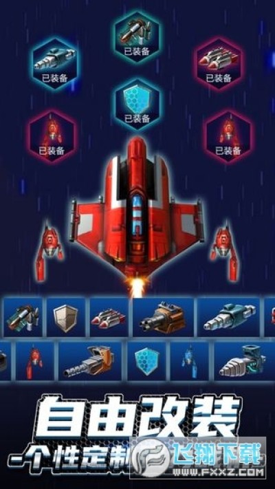 3、游戏中随时升级改装战机,各种装备武器包含副炮、电场护甲、闪电导弹等。