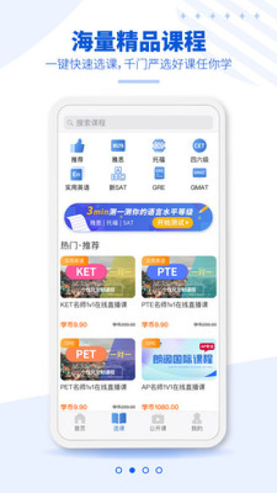 1、快速选课:涵盖雅思听力、雅思口语、雅思阅读、雅思写作、托福、剑桥雅思真题解析系列、剑桥英语、新概念英语、大学英语四级、六级、考研英语、BEC商务英语、实用英语、教师资格证、新SAT、GRE、GMAT、SSAT、ACT、AP、IB、ALEVEL、AEAS、PET、PTE、KET国际课程等在线学习课程,在线查看课程介绍,筛选适合的课程,线上选课购课,学习更快一步