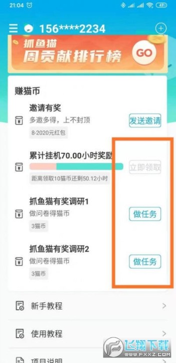 4、有调查任务也可以做,完成得6元,1猫币=1元。挂机满70小时得10元,1天挂机下来也可得1元多。