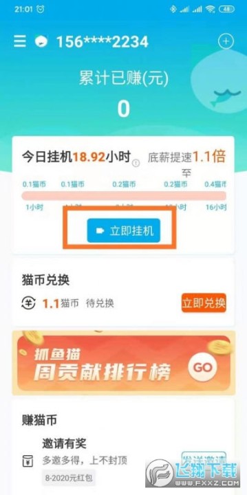 2、登录抓鱼猫,左上角完成提现认证,手动点开中间的挂机,开始挂机即可。