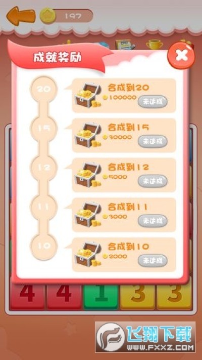 游戏方法为点击2个或者2个以上的相同数字,他们就会浮出来,再次点击就会合并为比之前更大的数字,比如从1合到2,从2合到3,让他们合并到更大,努力的合到10以上吧。