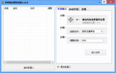 哔哔鼠标模拟机器人是一款鼠标模拟工具,软件分为手动和自动模拟按键方案,手动即直接设置模拟左右键按键,只要选择左右键设置单击时间! 自动方案是可以录制鼠标运行轨迹按键!