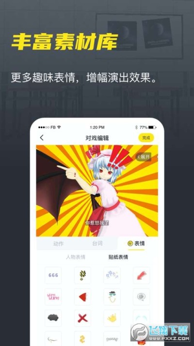 在这里你可以选择动漫人物模型,添加动作、背景特效、表情台词等元素,自己与亲友或是素不相识的陌生人来一场跨次元大乱斗,超简单mmd制作功能,点击马上成为同人动画制作带师~