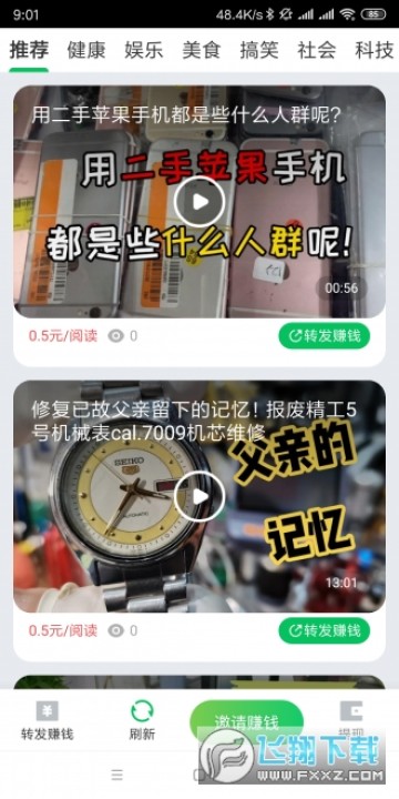 2、登录成功后,点击“转发赚钱”或者“视频”页面任选一篇文章/视频转发到微信,被有效阅读后即可获得奖励