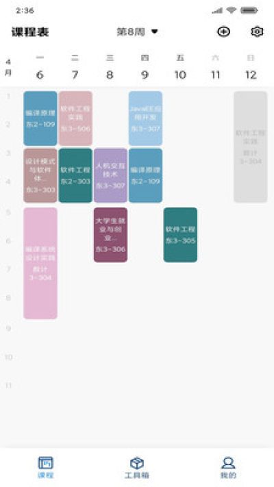 【课表】:简洁优雅的课程模块界面,灵活便利的切换方式,支持单双周切换、校历查询、触发课程详情、自定义课程功能,让你的课表不再杂乱无章。