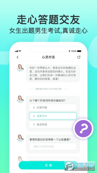 答题交友的机制。为了保障同学们可以真诚走心的去认识别人,我们提供了一种答题交友的交互机制,每个人都需要设置一套自己的试题,如果想认识别人,需要回答对方的试题,答题通过后双方才能成为好友自由对话。通过答题考试的形式实现一种精神层面的深层次交流,筛选交友对象,减少无用社交,提高社交的效率。
