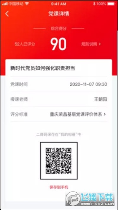 第二步:发起党课评价后,系统自动生成二维码。点击标题查询二维码,可保存到手机上或分享给学员,学员可使用微信扫描二维码后评分。