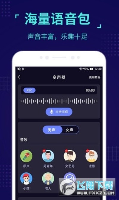 2、多种变声效果可选:爷爷、大叔、小孩、幽灵、机器人...... 变声时只需轻轻一点,让你成为自带BGM的潮人。