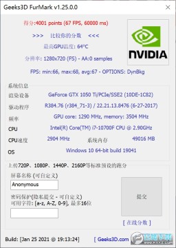 1分钟基准测试可以得到跑分并上传,在线比较你的得分情况,如图1280x720分辨率下跑1分钟得分4001,平均帧率67帧/s。