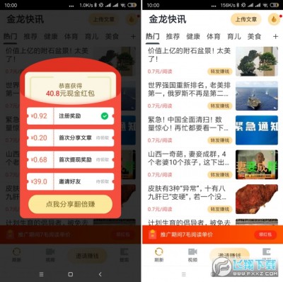 1、新人下载金龙快讯就送1元红包,转发文章单价0.5元至0.7元,支持上传文章