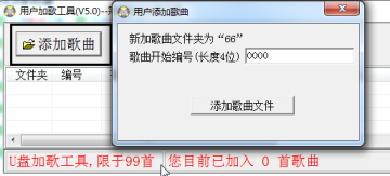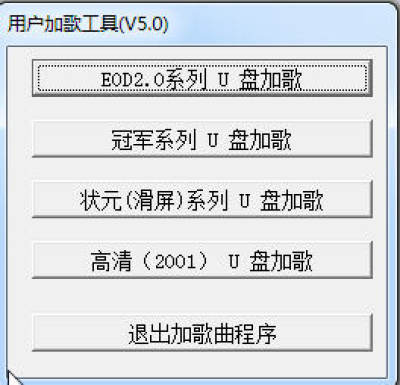 众所周知U盘,特别是容量比较小的U盘内主要给用户来装文档和歌曲的。加之现在的广场舞队伍的庞大,其中很大一部分都是歌曲文件,相信大家都给广场舞的阿姨们下载过歌曲。经常需要添加很多的歌曲文件,还容易出错。这个时候我就给深受其苦的网友们推荐用户加歌工具这款软件。它可以给u盘加歌曲的工具,支持eod2.0系列u盘加歌、冠军系列u盘加歌、状元(滑屏)系列u盘加歌、高清u盘加歌。一键搞定,让大妈们都惊讶不已。