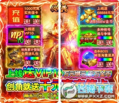 1、上线送VIP10、创角就送千元真实充值卡、绑元*68888、金币*8888W;
