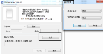 2、点击“选项”选择格式化的设置,确定后然后点击格式化即可完成操作。