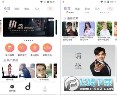 进去APP,首先展现的是音乐圈,里面有每日推荐、我的喜欢、本地音乐、听歌识曲等我们常用的功能。