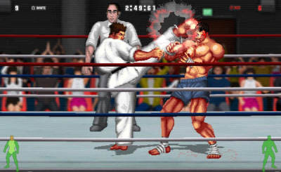 战斗中对战双方的身体的状态会用左右下方的小人显示,如一名选手的头部在不断遭受到伤害时,其对应小人的头部颜色会不断向红色变化,当变成深色时,该选手将被击败。当然如果在该部位遭到持续打击时,能够注意规避,通过策略性后退,将可以为伤势的恢复提供机会。