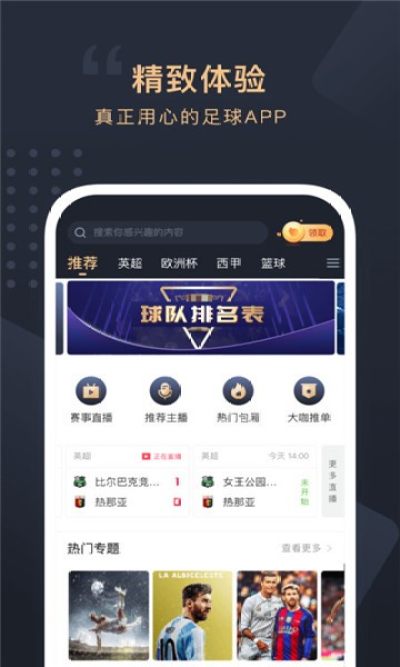 APP覆盖足球资讯,足球直播,足球视频集锦,赛事数据,用户社区,主题圈子