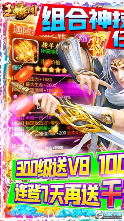 1.300级送1000元充值卡使用直升V8、100W元宝,7日登录再送1000元充值卡。每日在线领取200充值额度,无限送充值。