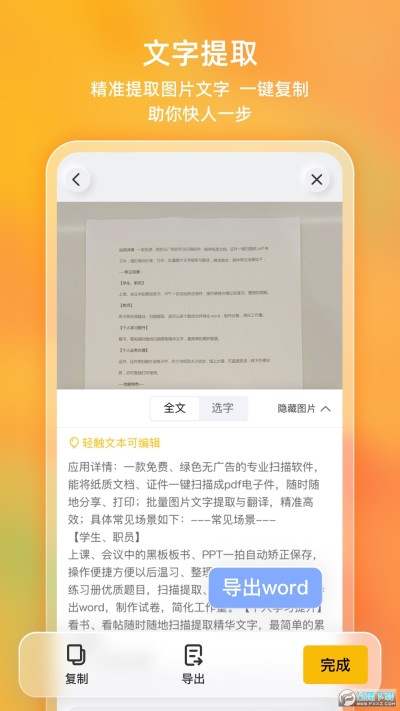 精准识别文字,可一键复制、编辑、翻译、校验,支持导出txt、word、PDF等格式;