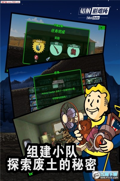 派遣您的居民到地面上,去探索被炸毁后的地面废墟,让他们在“废土”中冒险,寻找可用的幸存物,或是直面无言的死亡;找到新的装甲和武器,增长经验,然后赚取“瓶盖”。但记住,不要让他们死掉!