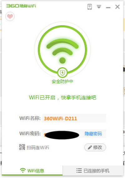 360连我wifi独立版是从360安全卫士中提取出来的,360安全卫士并不是很多人喜欢用,但是里面的一些小工具还是很实用的,360连我wifi独立版可以真正实现一键让电脑变为Wifi热点,使你的手机等其它任何具有Wifi连接功能的设备共享上网!这款360连我wifi独立版,即使在没有这装360 安全卫士的电脑上,也可直接使用360连我WiFi 。