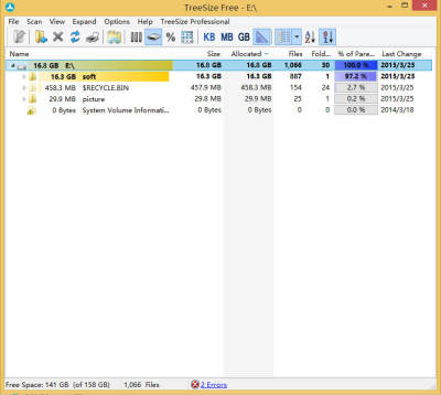 TreeSize Free使用方便,支持显示空间大小、占用空间、3D柱状图等图标分析显示工具,以及察看最近只用,文件作者,压缩率等功能,还支持将文件导出到多种文件中。