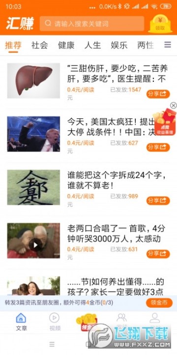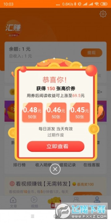 1、新人下载汇赚资讯立送1元,转发文章单价0.4元,文章/广告内容较干净