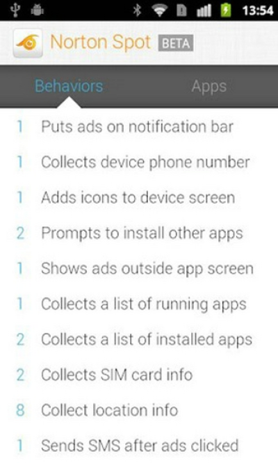 诺顿广告侦测Norton Spot Ad Detector是一款能够扫描手机中安装含有广告代码的应用,同时还可以对应用进行监控并报警,比如通知栏广告,创建桌面快捷方式,秘密收集个人信息等。