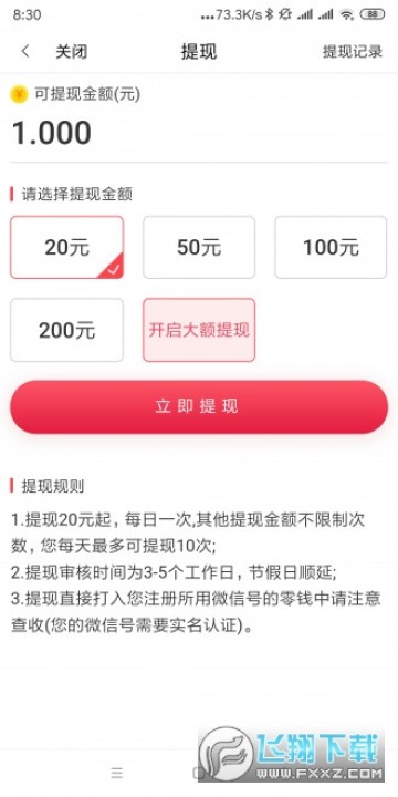 2、支持导入文章、搜索文章,永久满20元起提现,申请提现24小时内到账