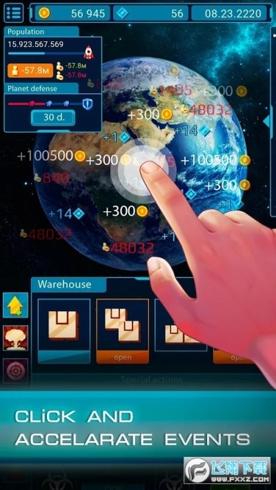 游戏《爆发感染:世界末日》中的每一秒都是一天。点击以加快破坏和感染的时间。遵循指标:人口,增加,减少等。