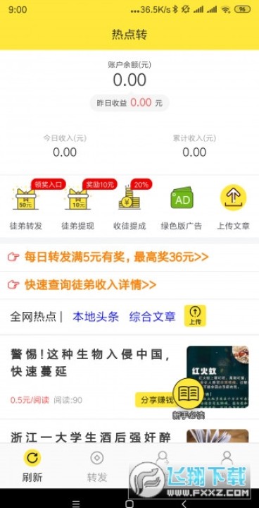1、在热点转上为用户准备了海量热点资讯,用户任意将热点资讯转发分享出去并获得好友阅读,那么就可以轻松获得现金奖励,主打转发给分多;