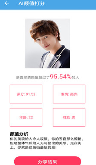 2、只需拍摄或从相册选择一张照片,等待几秒,即可测算,从“颜值”“表情”“年龄”“性别”四个方面进行测试。