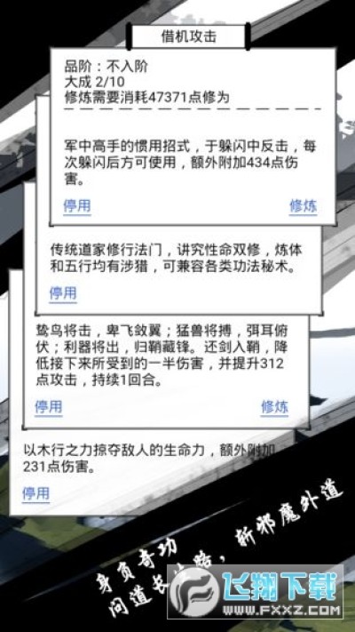 1、纯文字的江湖修真世界,采用回合制的战斗方式,虽然没有花哨的动画,但是玩起来依旧有趣;