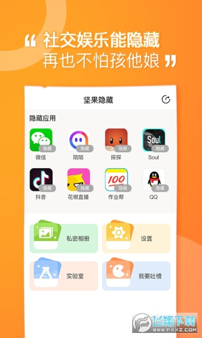 坚果隐藏是由专业团队打造的一款APP,能将您手机内的社交/娱乐应用等进行隐藏和隐私保护,全面保护您的个人隐私和资料安全。