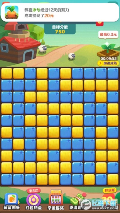感觉这个游戏的消除没有太多意义,一直领取上面漂浮的红包就行了,看两个视频后右边的作物就会成熟,收取得到0.3秒推微信。