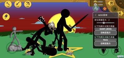 首先先说它的三种模式有经典模式,锦标赛模式,无尽丧尸模式,经典模式的玩法就像是新手教程一样,在前两关都会告诉你怎么用这些火柴人,在经典模式的最后一关就是大战巨人的那个关卡,可能有些人会不知道怎么打过去:首先你可以先用那两百黄金弄两个剑士,剩下的还黄金弄几个矿工,然后在等矿工把黄金弄到可以弄剑士的时候多弄几个,建议弄12个,(在前期的时候最好把剑士弄到满级)对了,还得要在商店里买两个到三个的强化剑士药水,这样打击人的时候就不要那么费劲了。等到可以弄弓箭手的时候弄两排,也可以再弄两个挖矿的。然后就是第二波敌人来了,杀了一些剑士,然后弄一个法师。长毛兵就不要用了。到了最后尽量多弄一些巨人2到3个,黄金必须保持在6000到8000黄金之内。因为打最终boss的时候很费黄金的。到了打boss的时候,你就用强化药水强化剑士,这样就可以打败了。(巨人也要满级)(弓箭手也要满级)