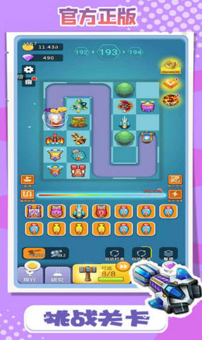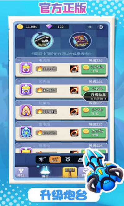 3.炮台的升级是合成的方式,这个游戏方式也是比较不同的,所以游戏整体偏向休闲,半放置。