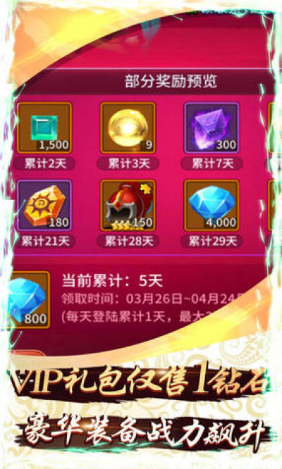 4、丰富多彩的活动,参与即可获得海量元宝及珍贵道具。种类繁多的礼包,奖励丰厚值得拥有。