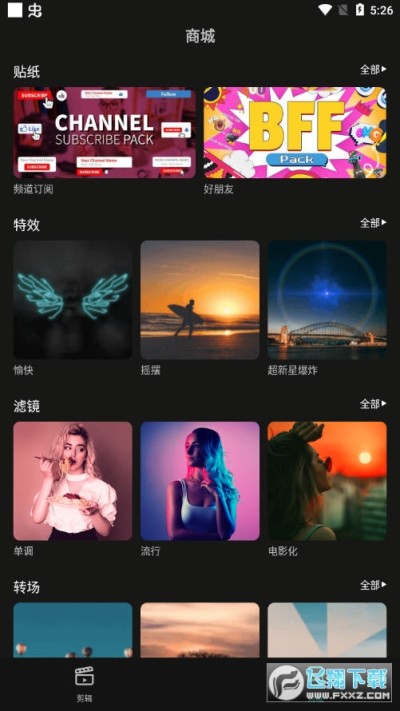 各大Vlogger、YouTuber、B站up主以及微博大V力荐的特效资源,包括多种文字特效、海外版权音乐库、时下热门的ins滤镜、炫酷转场与动态贴纸……