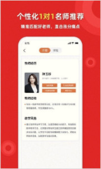 家教一对一辅导的老师是从全国各地挑选的拥有5年以上一线教学经验的名师,五层专业筛选,通过率只有1.26%。所有授课老师必须科班出身:有过硬的专业知识、出色的授课技巧;必须带过毕业班:精通历年考试考点,尤其擅长突击式强化提分,孩子提分事半功倍;必须有丰富的教学经验:能快速、准确地发现孩子问题,并制定有效的教学方案,能针对孩子性格特点进行沟通,使孩子乐于面对问题,保持积极向上的学习心态;必须带出过学霸:除了让孩子学到扎实的基础知识,还要擅于培养孩子的创造性思维能力,让难点题型轻松突破。