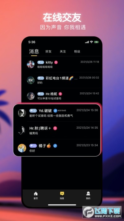 认识更多声音优质,长相帅气的小哥哥进行互动,欣赏多种多样的语音才艺表演,小伙伴聚集在一起互动娱乐,结识新朋友。私信聊天开启属于你们两个人的私密交友,倾诉你的心声,表达你的爱意。