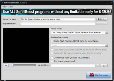 Soft4Boost Video to Flash 是一个功能简单实用,转换效率高,免费安全的媒体转换工具,它可以将常见的视频格式转换成SWF格式的Flash动画,另外如果您打算把swf引入到网页中,程序还可以生成flash调用网页代码,非常的方便!软件对很多视频格式进行了设置,减少了用户不必要的操作选项,让这款英文软件也适合国内用户使用。