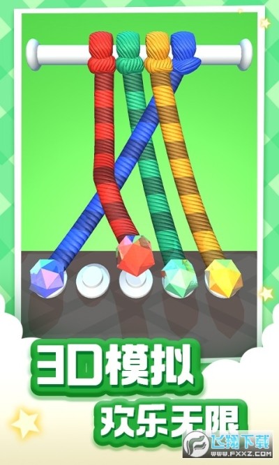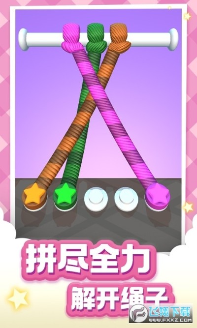 1、《绳索达人》是一款超有趣的解绳子游戏。游戏画风简约,玩法新颖独特,操作简单。在这绳索达人游戏里,不同颜色的绳子缠绕在一起,玩家需要想方设法将它们按照颜色解开,并进行归类,喜欢的话就下载试玩吧