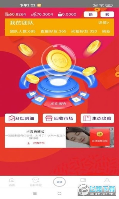4.持有PC币每天15点分红,也可以直接回收,点击持有PC或者“分红”-“回收市场”就可以看到,最低3PC币回收,1币单价0.12元,账户里需要保留10PC。