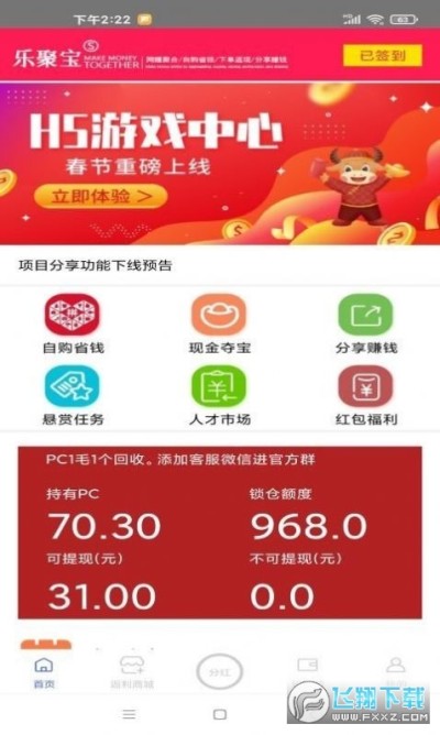 乐聚宝之前叫“尚唯云印”,新用户注册免费赠送10PC币,每天签到1PC币,看广告,做任务得,也可以获得PC币,持有PC币每天可以分红,也可以直接卖出变现,当前1PC币0.12元,新用户还有个新手任务,签到15天领4元,首次试玩领1元,最低满1元提现!