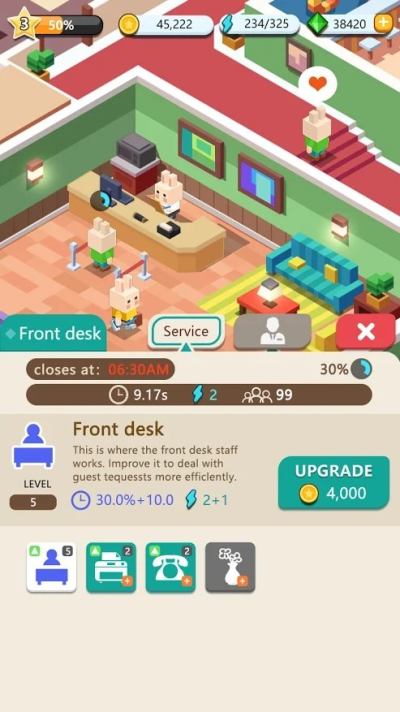 游戏中你将化身为温泉店的老板,你的目的就是让温泉店的生意火爆,于是你将开始制定一些优惠活动来吸引客户,玩家想要提升自己的生意,就需要不断去挖掘,只有深入的挖掘,才能开启属于你的宾馆之旅。
