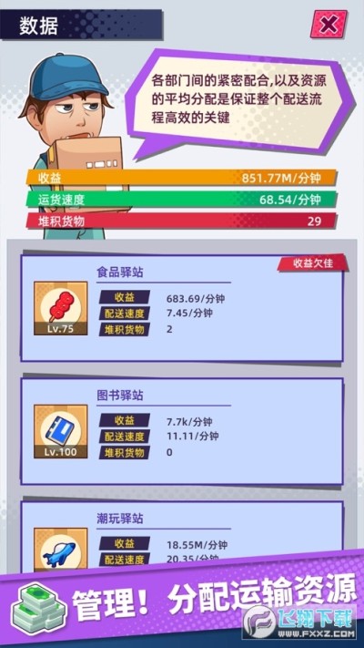 在电商社会里,快递行业一定是一个很赚钱的行业,想不想经营一家快递公司快速致富?建立一个快递中心,接收全国各地的快件,进行快递分拣,再招聘几个快递小哥,把货物送到收件人手中。为了提升公司的赚钱效率,您必须扩充多个中转的驿站点,招聘得力的店长,提高快递员的管理,大大提升送快递的效率。