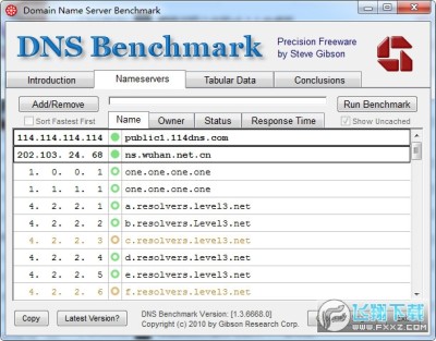 2、点击“Run Benchmark”按钮运行基准测试。(可能需要几分钟才能完成。另外,旁边的add/remove按钮可以在测试以前添加或移除DNS,有计算机基础,E文还行的同学可尝试)